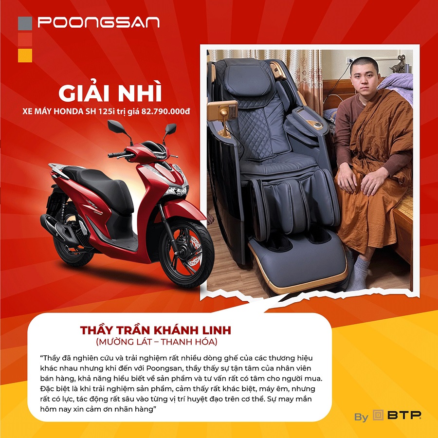 Chia sẻ với Poongsan, vị khách hàng may mắn nhận giải đầu tiên sư thầy Trần Khánh Linh – Mường Lát, Thanh Hóa chia sẻ: “Cảm xúc đầu tiên của Thầy là quá vui và cảm thấy mình may mắn. Thầy đã nghiên cứu và trải nghiệm rất nhiều dòng ghế của các thương hiệu khác nhau nhưng khi đến với Poongsan, thầy thấy sự tận tâm của nhân viên bán hàng, khả năng hiểu biết về sản phẩm và tư vấn rất có tâm cho người mua. Đặc biệt là khi trải nghiệm sản phẩm, cảm thấy rất khác biệt, máy êm, nhưng rất có lực, tác động rất sâu vào từng vị trí huyệt đạo trên cơ thể. Thầy cảm thấy thoải mái và thư giãn sau khi dùng. Đến nay đã gần 1 tháng sử dụng, quả thật tình trạng mỏi cổ vai gáy của thầy có nhiều chuyển biến tích cực”