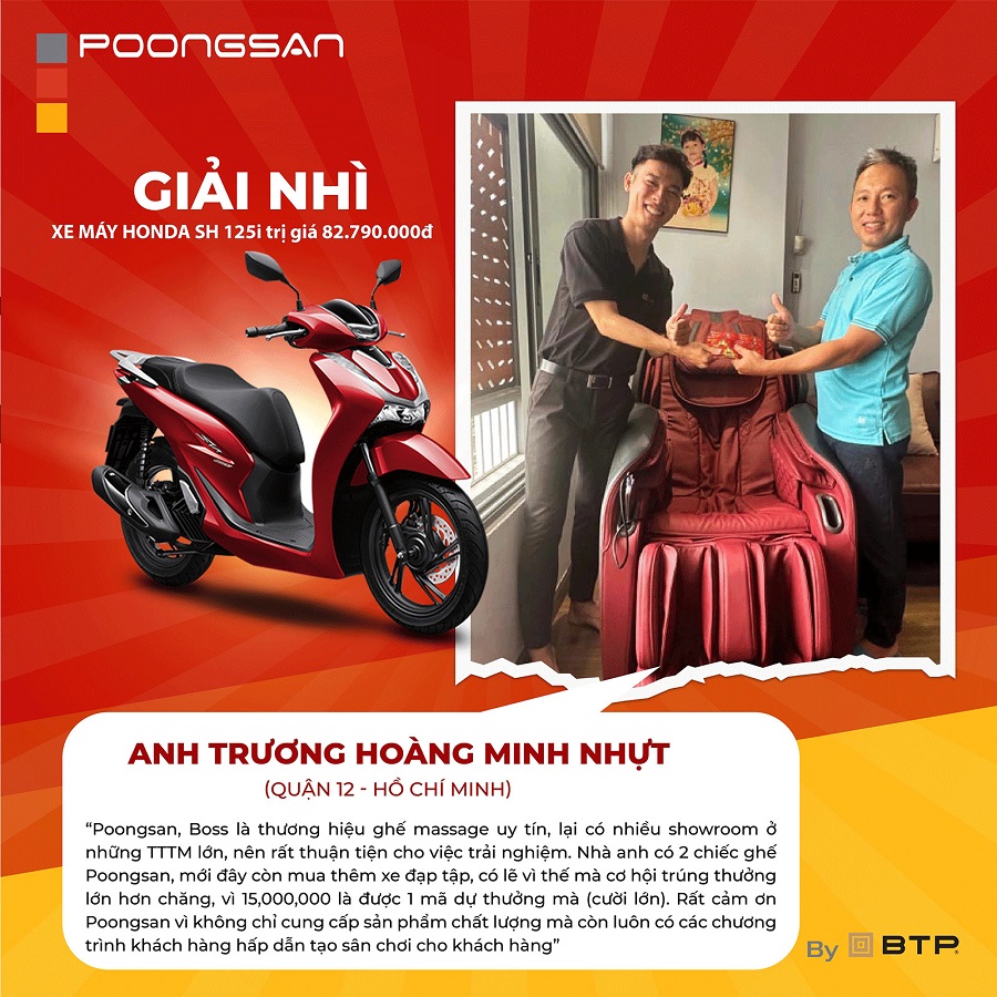 Anh Trương Hoàng Minh Nhựt - Quận 12, TPHCM khách hàng may mắn tiếp theo bộc bạch: “Poongsan, Boss là thương hiệu ghế massage uy tín, lại có nhiều showroom ở những TTTM lớn, nên rất thuận tiện cho việc trải nghiệm. Nhà anh có 2 chiếc ghế Poongsan, mới đây còn mua thêm xe đạp tập, có lẽ vì thế mà cơ hội trúng thưởng lớn hơn chăng, vì 15,000,000 là được 1 mã dự thưởng mà (cười lớn). Rất cảm ơn Poongsan vì không chỉ cung cấp sản phẩm chất lượng mà còn luôn có các chương trình khách hàng hấp dẫn tạo sân chơi cho khác hàng.”