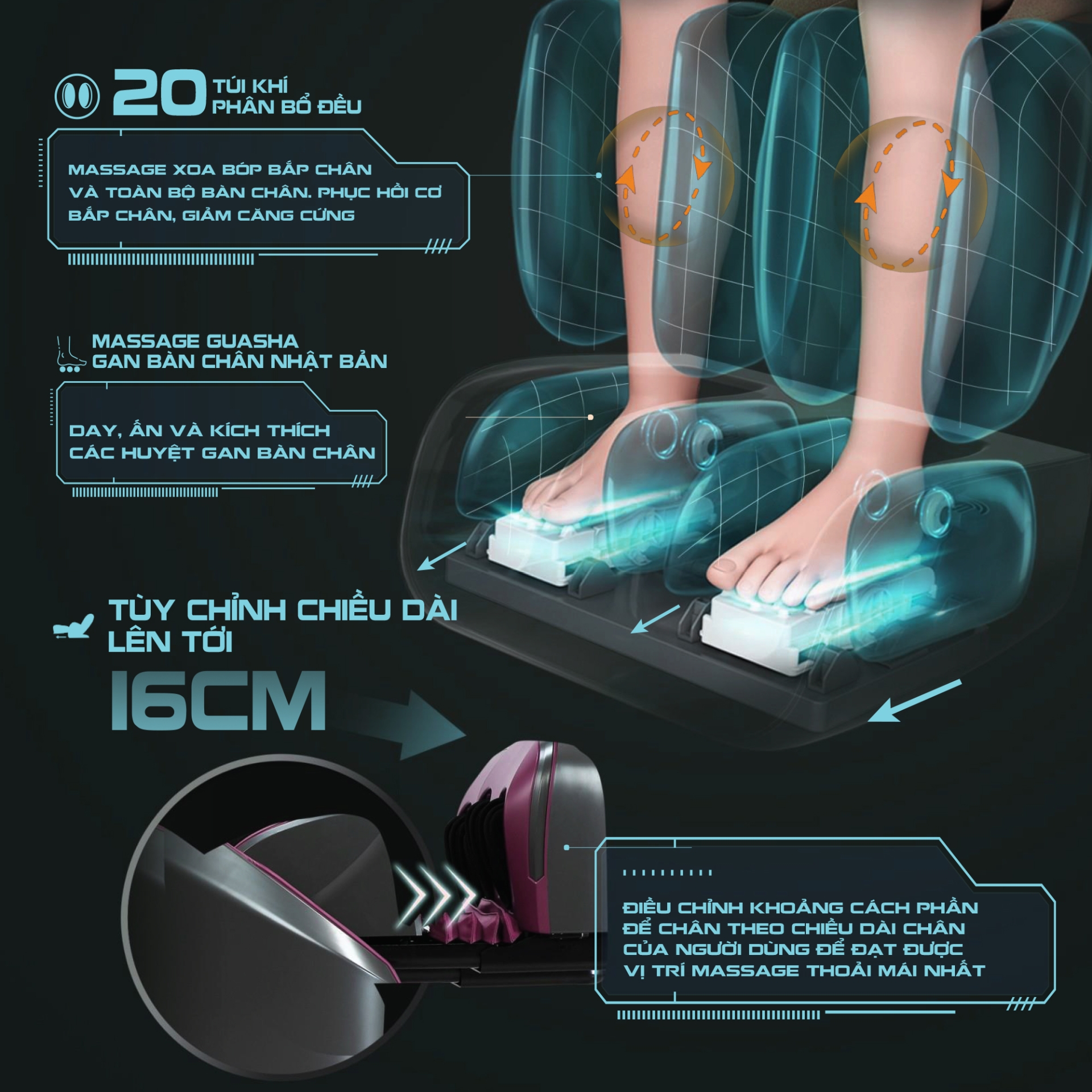 | Massage chân | Massage guasha kết hợp 6 bộ bi lăn, massage ngón chân, cuộn gan bàn chân, cùng bi xoáy ở bắp chân và hệ thống túi khí bóp nhả linh hoạt. |