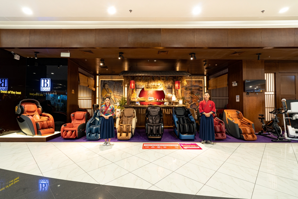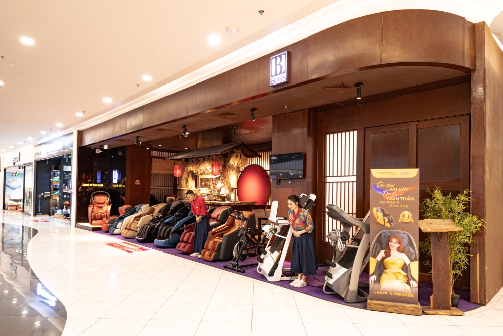 Gian hàng Boss Wakasa trưng bày nhiều mẫu ghế massage và các thiết bị thể dục thể thao