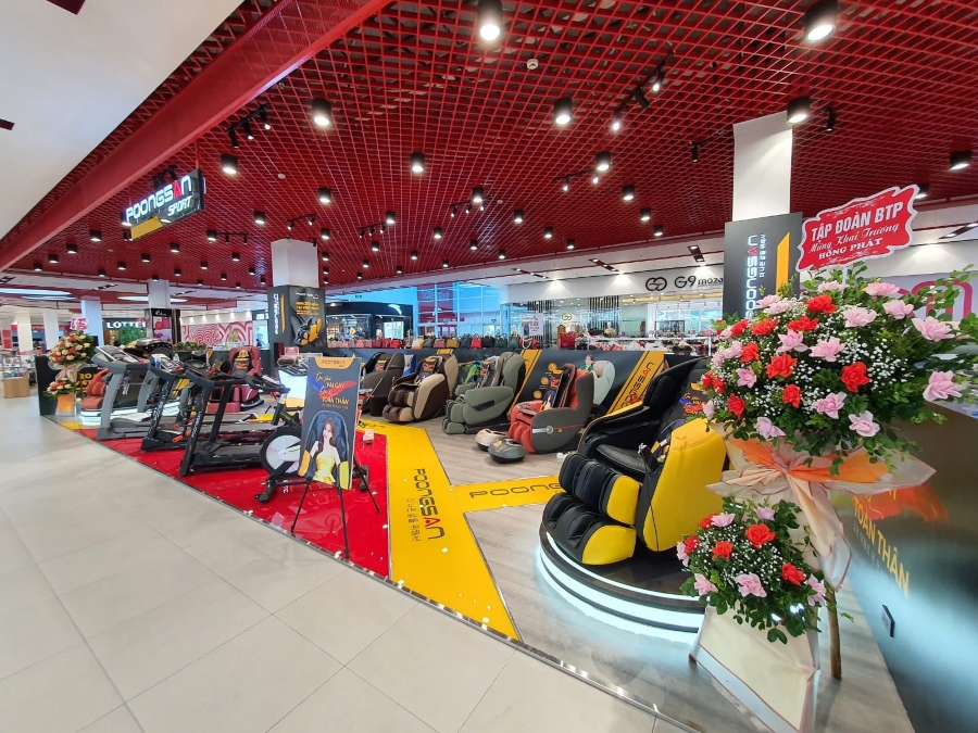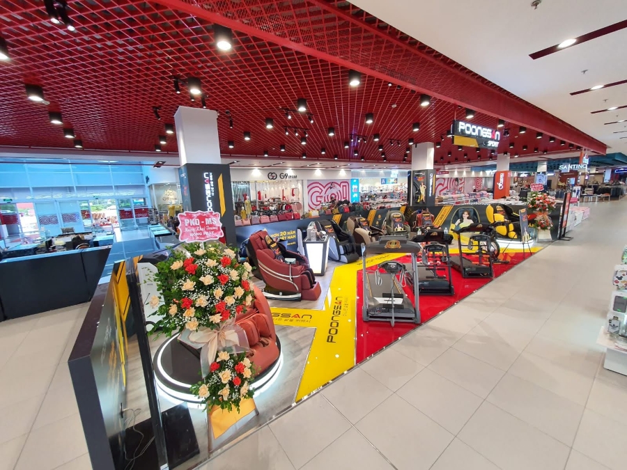 Gian hàng Poongsan tại TTTM GO! Nam Định có không gian rộng rãi, nằm ngay tầng 1 của tòa nhà. Các sản phẩm được bày bán đa dạng, trong đó có các mẫu ghế massage và các thiết bị tập thể dục như máy chạy bộ, xe đạp tập… Dưới đây là một số hình ảnh thực tế tại gian hàng ghế massage Poongsan.