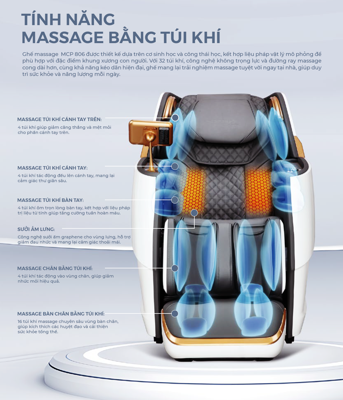 Ghế massage Poongsan MCP 806 còn tích hợp công nghệ massage khí nén độc đáo. Đây là một trong những yếu tố giúp sản phẩm trở nên khác biệt và được người tiêu dùng ưa chuộng. Công nghệ massage khí nén trên ghế Poongsan MCP 806 hoạt động bằng cách bơm khí vào các túi khí được bố trí khắp cơ thể. Khi túi khí phồng lên và xẹp xuống, chúng tạo ra các lực ép và thả lỏng, mô phỏng các động tác massage chuyên nghiệp.
