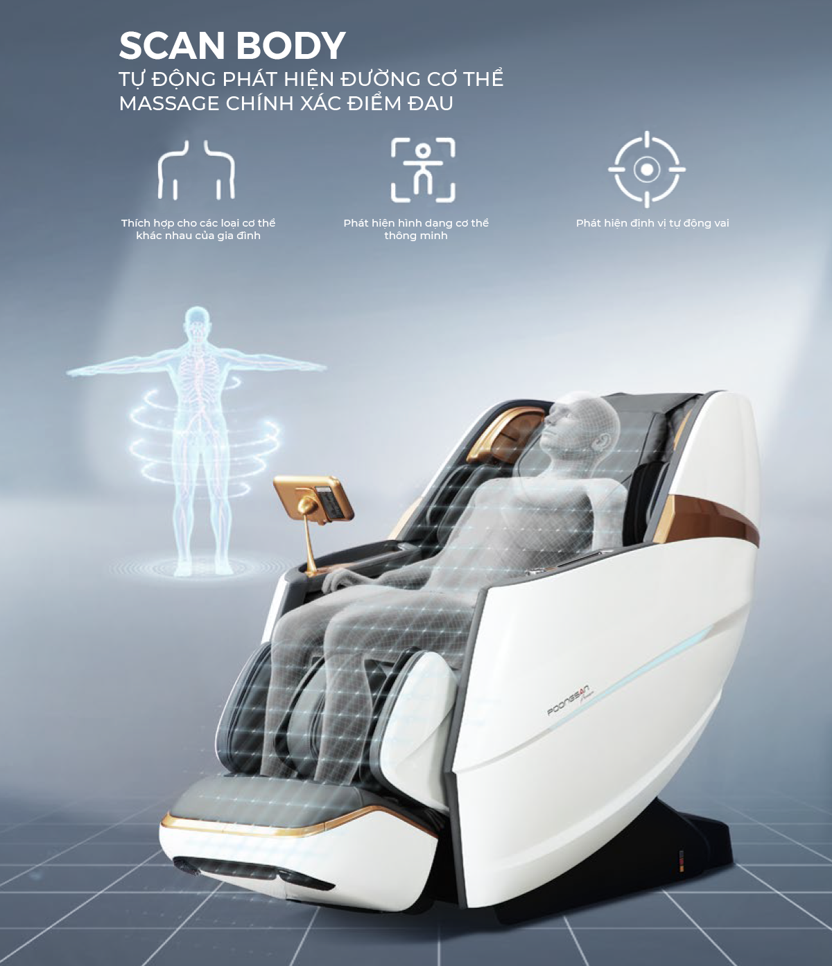 Chế độ Scan Body trên ghế massage Poongsan MCP 806 là một tính năng cao cấp giúp ghế tự động quét và xác định hình dạng cơ thể người sử dụng, từ đó điều chỉnh các con lăn và túi khí sao cho phù hợp nhất. Với khả năng phát hiện kích thước và hình dáng cơ thể, chế độ này đảm bảo rằng mỗi người dùng đều nhận được một trải nghiệm massage tối ưu và chính xác, giúp giảm thiểu cảm giác khó chịu do sai lệch vị trí massage.