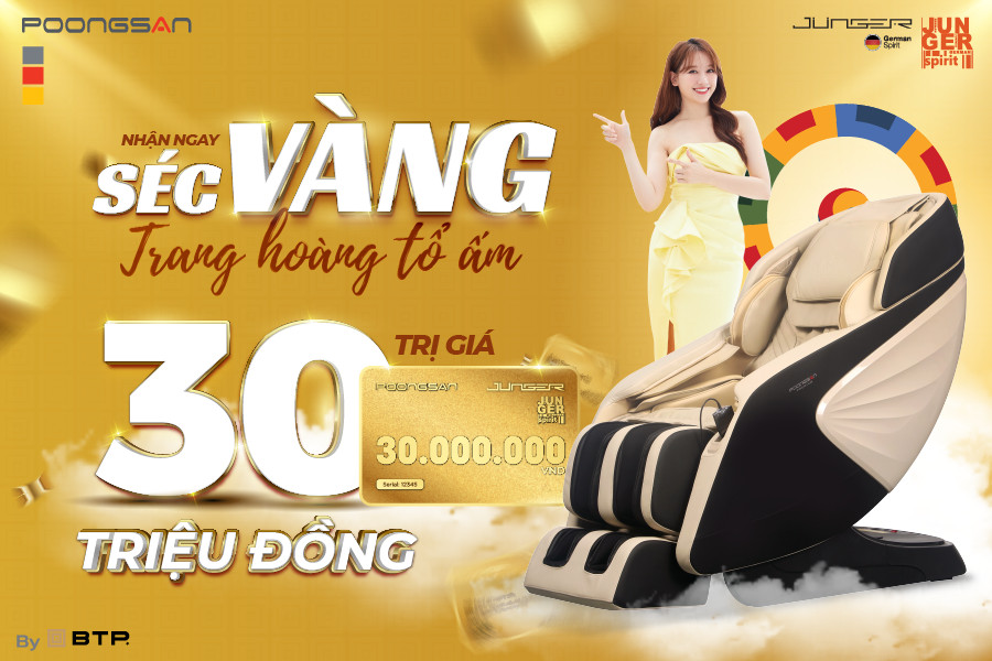 Theo đó, khi khách hàng sở hữu 1 trong 2 mã ghế massage Poongsan sẽ được giảm giá lên đến 45.000.000đ và Tặng Séc vàng trị giá 30.000.000đ để mua các sản phẩm gia dụng Junger trong chương trình hợp tác.
