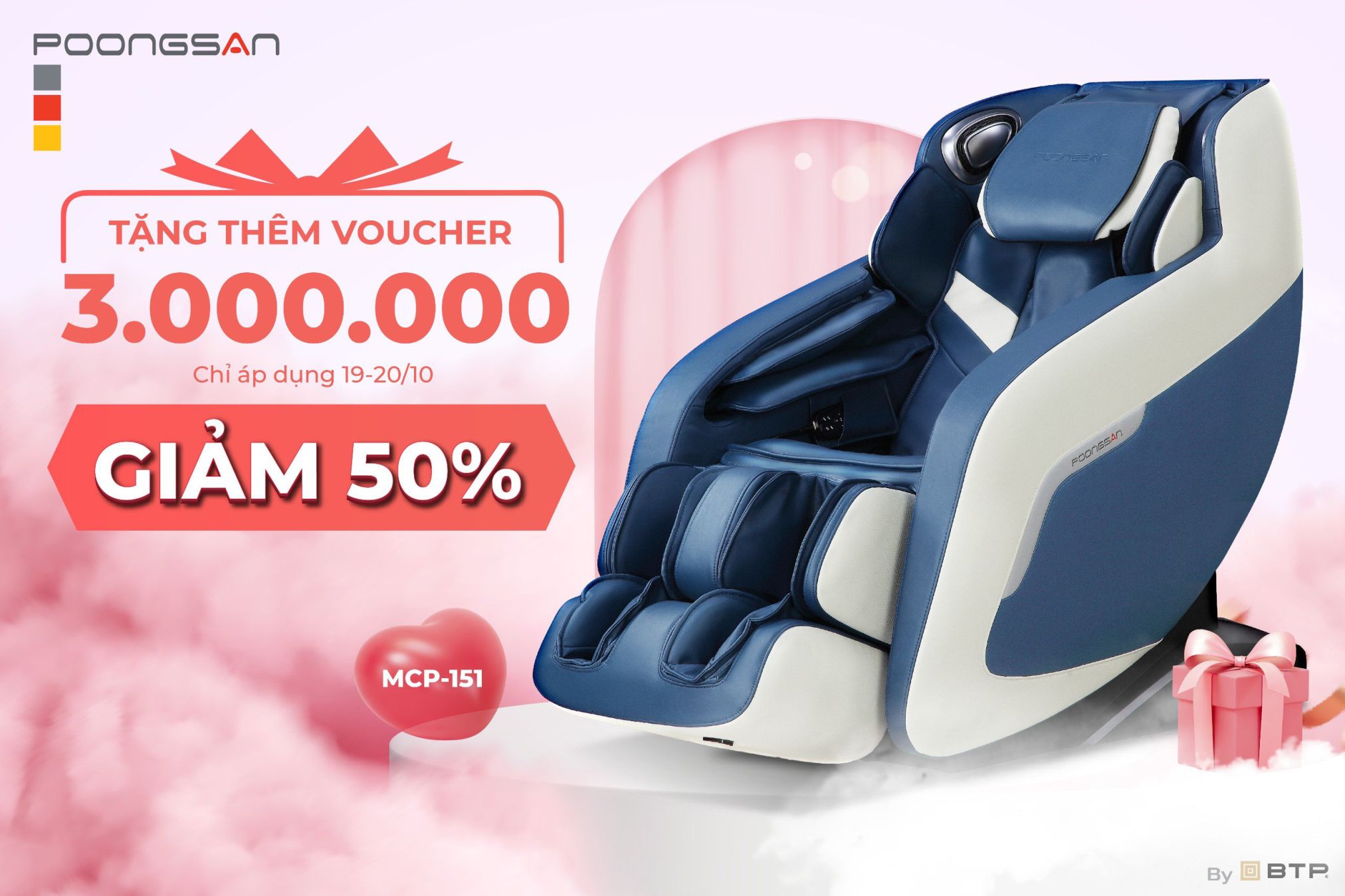 Hãy để Poongsan cùng bạn chăm sóc một nửa thế giới với voucher khuyến mãi 50% cực khủng. Chỉ duy nhất ngày 19-20/10, Poongsan giảm thêm 3 triệu khi mua ghế massage MCP-151. Sẽ thật ý nghĩa khi bạn dành tặng mẹ, tặng vợ món quà sức khỏe thiết thực và ý nghĩa.