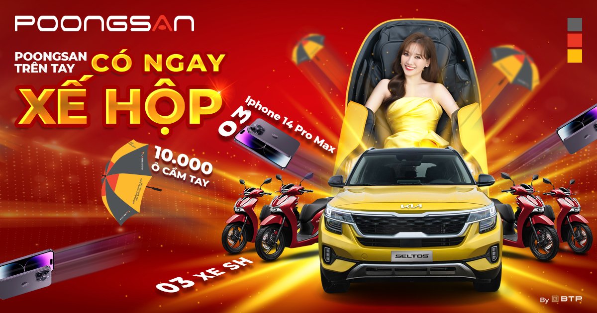 Đầu Xuân Quý Mão 2023 này, xuất phát từ mong muốn mang lại may mắn và gia tăng các giá trị trải nghiệm tuyệt vời cho khách hàng, Poongsan quyết định “chơi lớn” tặng phiếu bốc thăm may mắn cho khách hàng với các giải thưởng giá trị rất cao như: Điện thoai Iphone 14 Promax, Xe máy Honda SH, đặc biệt là Oto Kia Seltos và 10000 quà tặng giá trị lên tới hàng tỷ đồng.